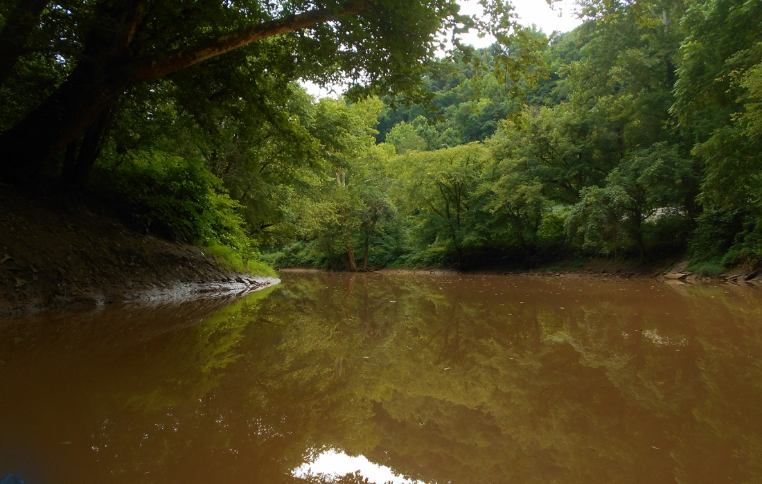 Just past this ramp you may notice a swamped boat on the right side. Things like this always make me wonder as to what went wrong. It looks like this was a really nice boat at one time! Anyway, the view below is typical of this stream where you'll find that a railroad will follow you along the right side almost all the way. At about the 3 mile mark there's a concrete overlook on your left side that appears to be on the grounds of the Wetzel County 4H Camp.