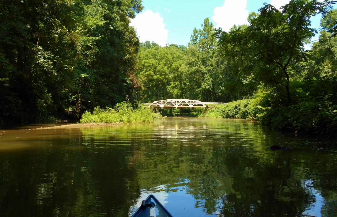 In this section as well in most sections of the Ohio River you won't really have a whole lot of silence, what with roadways usually running directly beside the river. You will most often also find a railroad track running alongside of you on one side or another. Thus, it's not often that you will really be able to be totally at peace with nature. The exceptions to this (if you can get back far enough into them to get away from things) can be the side streams. One of these comes in at the upriver tip of Mill Creek island at mile 141. Guess what it's called - Mill Creek! I was able to get back only about 500 yards but this one is really pretty. Even the road bridge is picturesque in my opinion...