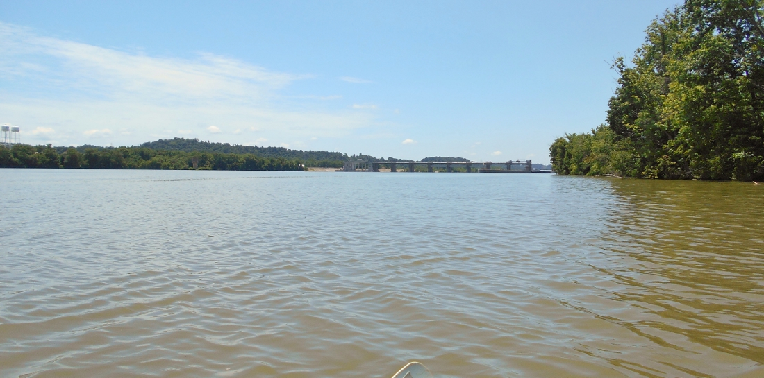 Starting at the dam now near mile 162... You can see it in the picture below... This is a close as I'll get to a lock and dam at this point, both because I've never locked through one before and because I don't want the lockmasters to be inconvenienced into thinking that I might want to lock through. I don't want them to think that they have to wait for me so I don't get too close or linger too long.