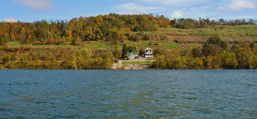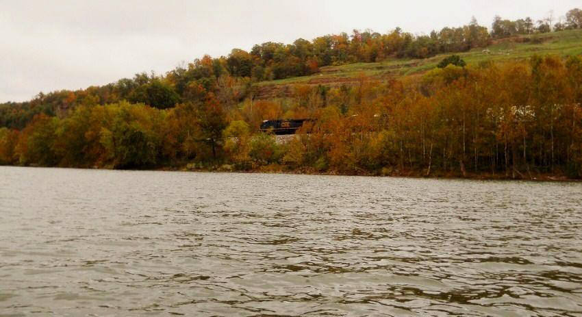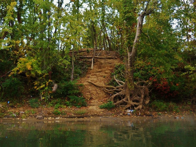 At any rate, after you pass the island you’ll note that perhaps the most striking feature is the mountainside in West Virginia amid the community of Portland Station. It’s been carved out to make room for some railroad tracks, and the striations in the rock make for some interesting scenes. This is at mile 216 where Skull Run enters the river un-navigable under a small culvert. By the way, the photos below look different because they were taken at different times of day, yet they're both of this same area.