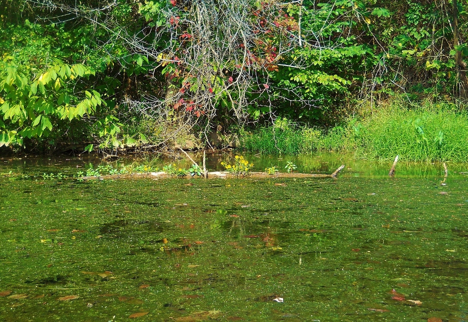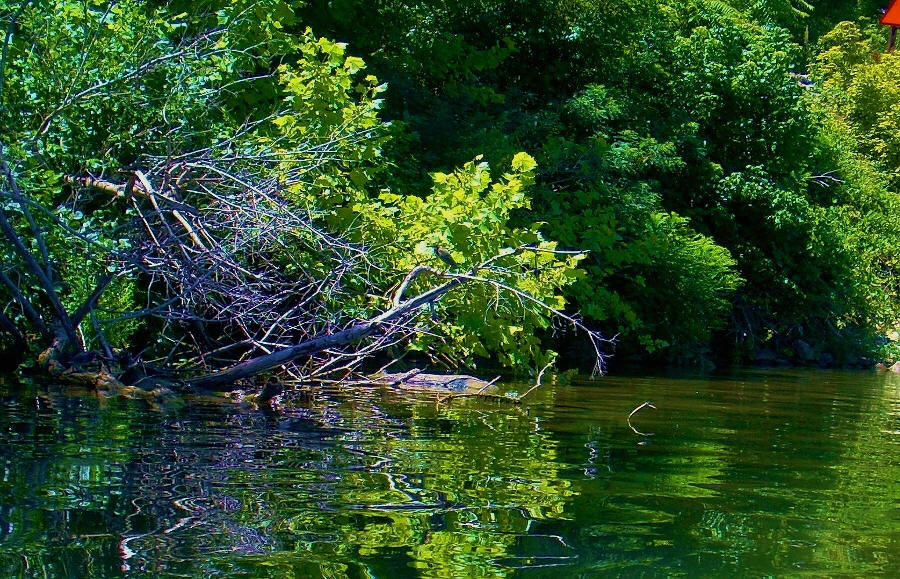I saw a bird in here of the kind that I often see on the water and in looking into it further, I believe that this is a cormorant. I most often see these along the shoreline in low lying tree branches, but I've also see them dive underwater to catch fish. They can stay under quite a while too! The bird is in the center of the photo below. Hopefully you can see it. These birds can be quite well comouflaged!