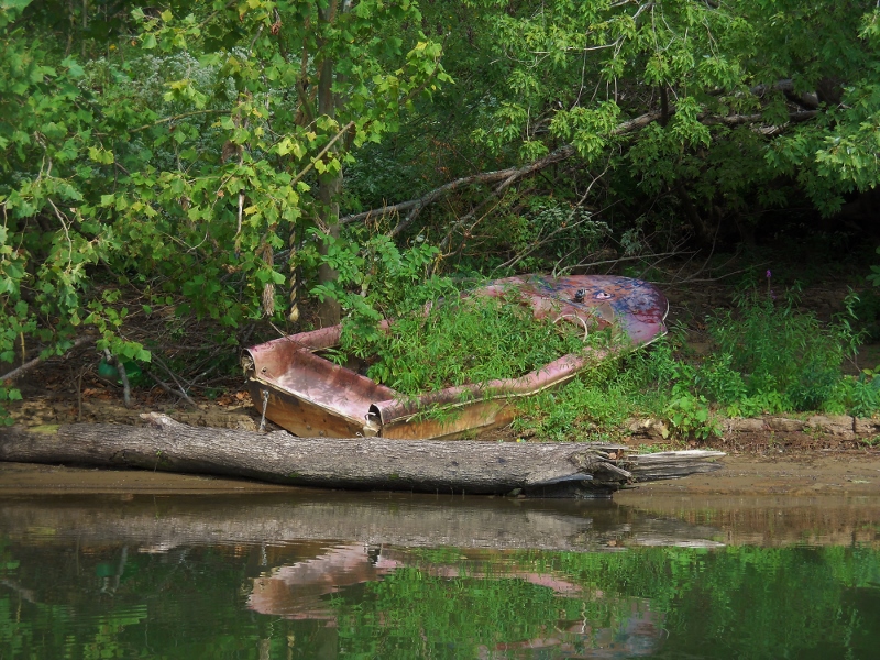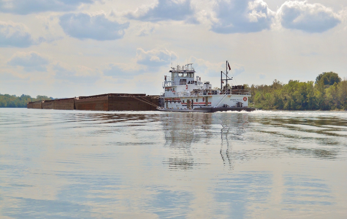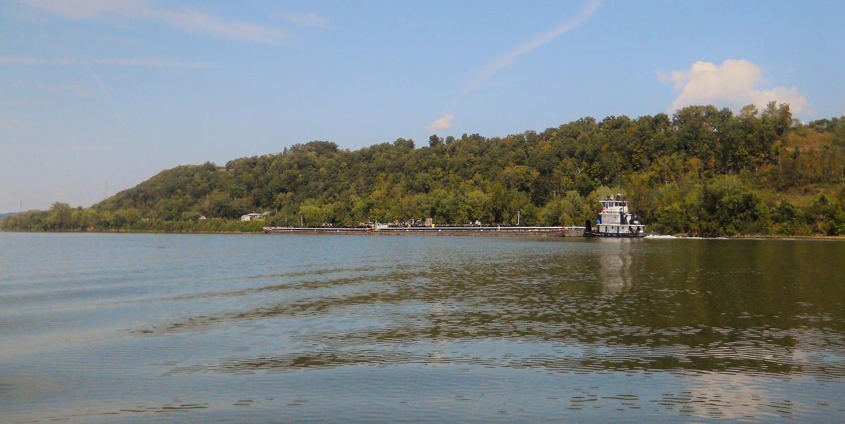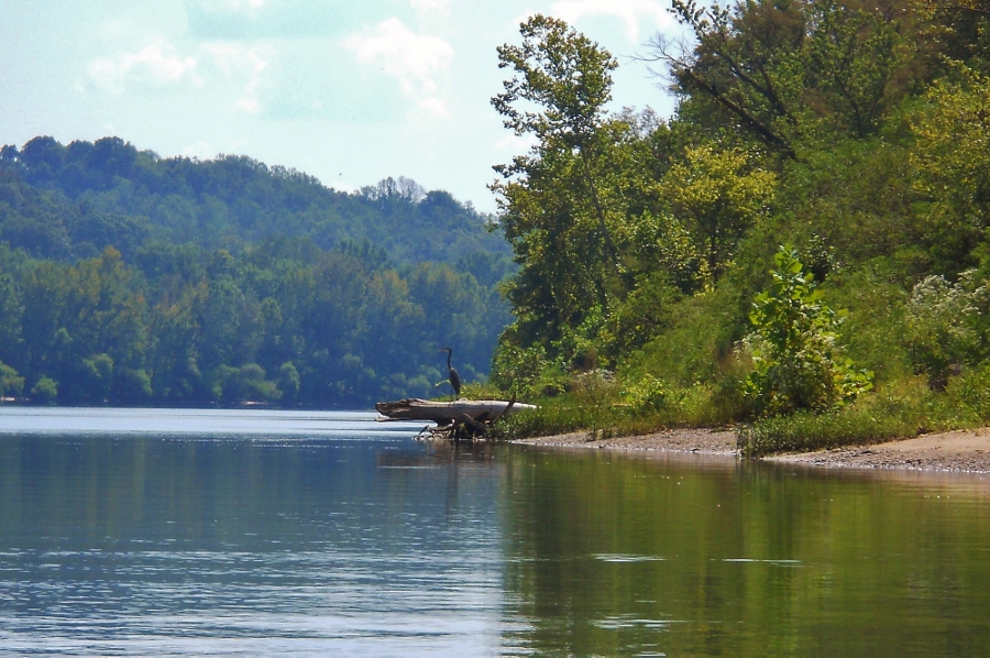From here on out things will be pretty quiet with only a couple light and day markers and an occassional car on the road to interrupt your reverie. You'll be rounding a right bend as you make your last 3 miles up to the dam and in this area you’re apt to find the beaches on the left in West Virginia to be pretty inviting. Some of them even make for convenient spots to stop and rest as the heron below was doing. In Ohio the shorelines are rocky until you get to the dam and there are some interesting formations in spots. As for the vessel you see coming and going in the photos below, that's the S. W. Price of AM&O Towing.