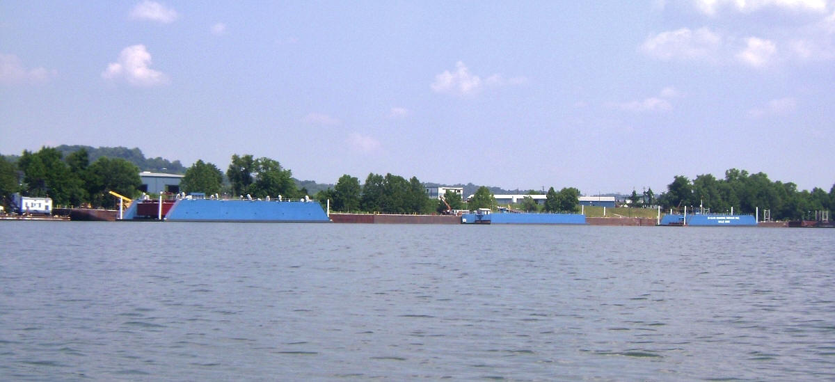 Meanwhile, on the Ohio side of the river you’ll see a facility which is prominently indicated as being O-Kan Marine Repair Inc. at mile 266. The push boat I’d paddled around earlier was marked with its insignia and it was really doing a lot of work today. As I look at the company website now, I see the reason. O-Kan offers quite a few services besides repair. They also rent barges, they have shops for machining and fabrication and they’ve also got a couple floating cranes. Dry-docking services are available too. In fact, the 3 blue “walls” you’ll see here actually look to be part of mechanisms which lift vessels out of the water – and not just small vessels either. These have a 3500 ton capacity (my understanding is that a car weighs about 2 tons)!