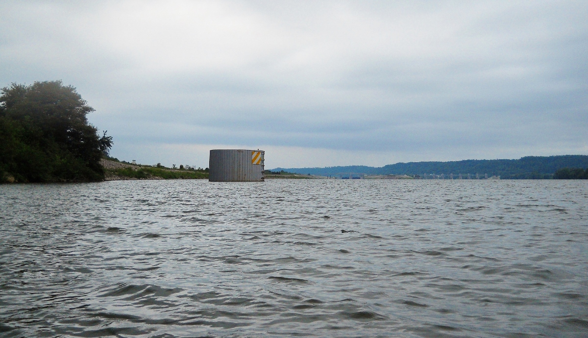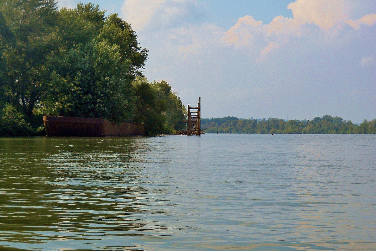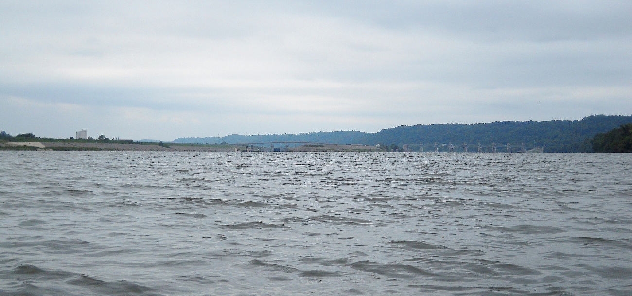 When I got to the Ohio side I got a Teens Run disappointment. I'd wanted to paddle in, but the mouth was just beyond the restricted zone! I couldn’t explore it (or at least bring myself to violate the zone). There was something else though… There used to be an old lock and dam structure here just upstream from the new one – old #26 - but I found no trace of it! I’ve passed these before but I’ve always been able to see at least some hint of what used to be. In fact, most of these locations still have the old lock houses up on the shore, but such was not the case here. The only clue you’d have is a little lane off Ohio Route 7 called “Old Lock 26 Road”! My eyes met with the scene below at about this point.