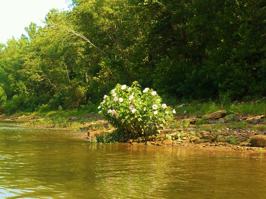 Upon emerging from this stream you’ll clearly be able to see the dam up ahead along with some mooring cells, but before reaching it you'll continue to find nice stretches of beach on both sides of the river. I decided to take a break on the West Virginia side to wait as a couple push boats passed, and in doing so I had some very pretty flowering shrubs as company. I don’t know the proper name for them but they'd show up at regular intervals over the course of the day. Their flowers seemed to alternate pleasant hues of pink and white…