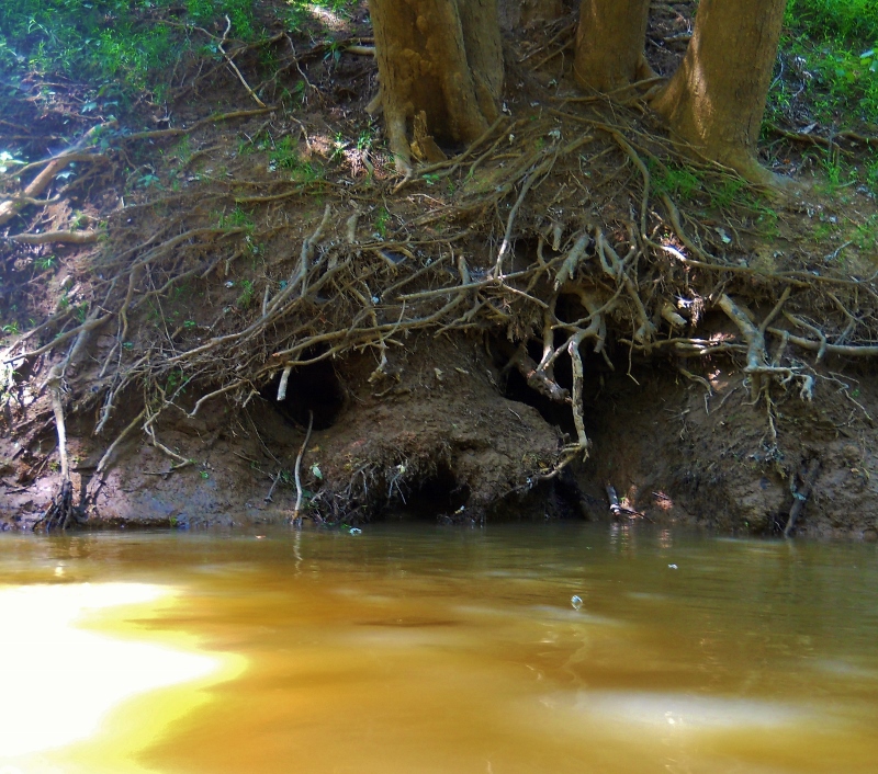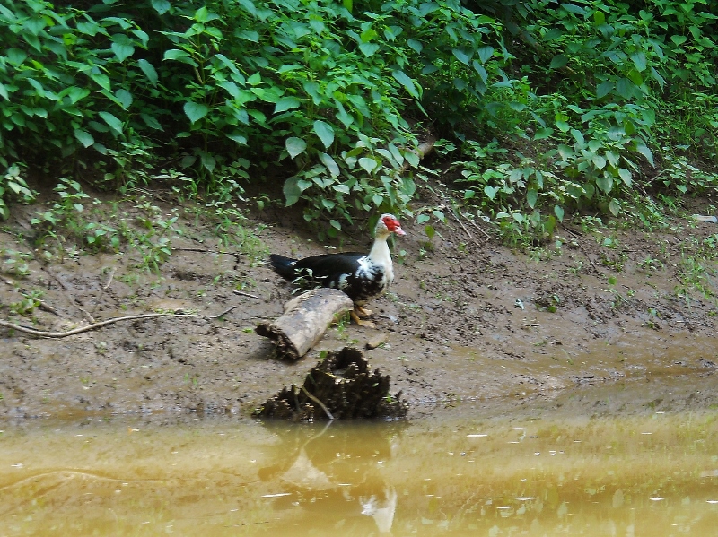 Why the name Eighteen Mile Creek? Well, it appears that it’s 18 miles downriver from the mouth of the Kanawha River at Point Pleasant, West Virginia. I got in roughly ¼ mile, in the process finding it abundant with wildlife. Not only was it teeming with the little fish, but at one point I heard some fairly loud “splooshes”. Looking around, I just happened to spot a trio of critters launching themselves into the water from holes just above the surface. They looked like beaver but – of course – it was too late to take a picture! Then, at another point I spotted an animal just ready to pop out of its hole, but when it saw me it went right back in! I couldn’t tell exactly what this creature was either, but it could have been anything from a beaver to an otter to simply a squirrel. I don’t know. Finally, as I paddled out I encountered an animal I could actually identify - the Muscovy Duck below. It was probably there when I came in, but it was so incredibly mellow that I may have missed it!