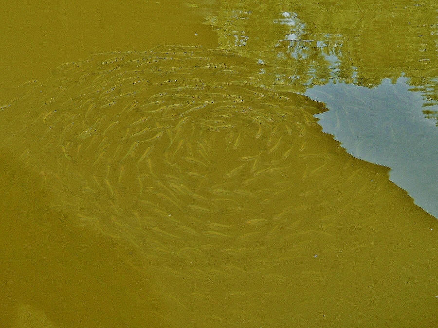 Turns out, the alga actually provided something else - a great habitat for the likewise abundant schools of little minnows I’d see. There must have been millions if not billions of these and by the time I'd gotten down to the Guyan Creek (a.k.a. the Little Guyandotte River) at 287.5 to begin I’d encountered these little fish in full measure. I love the incredible circles they form! The photo below was taken inside the creek. Isn't that cool?!? The first such circle I ever saw was on the Kentucky River and it was so dense that I actually thought it was a tire underwater! Anyway, I was able to get back about 1/4 mile into Guyan Creek.