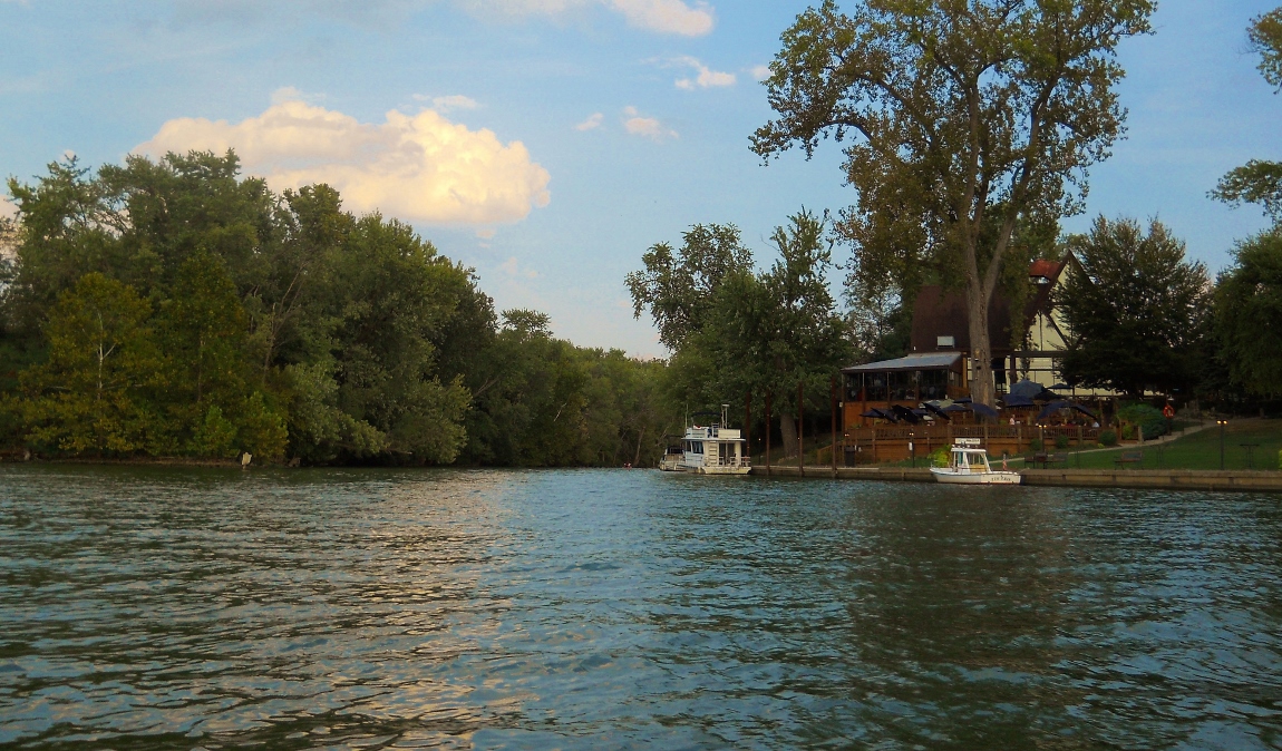 Anyway, once on the opposite shoreline I was at a point near the Rose Island Yacht Club cove. A ramp entered just upstream from the cove, but I couldn’t tell if it was public. Downstream there was a row of identically constructed homes (or condominiums) and Heather’s on the River was here too, although the bar and restaurant didn’t show any signs of life. I wasn’t sure if it was still operating. The location is now called The Drift Bar Prospect.
