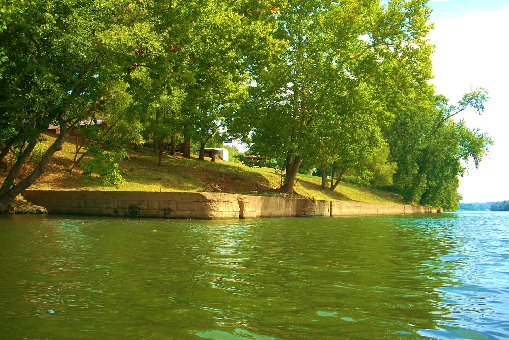 Next comes a long, stone embankment that extends upriver for 4,000 yards according to some signs here. Thus begins the Winfield Lock and Dam grounds. According to the link provided, these grounds are quite notable as they contain five recreation areas, a visitors center, an overlook, some observation areas, several wildlife ponds and all of this area can be used for fishing acess. You'll note what look like walkways down to the river in the second photo below. As I paddled by I wondered if they'd allow you use these to put a kayal in. That sure would make it easier for me to come back and see how far back Hurrican Creek goes!