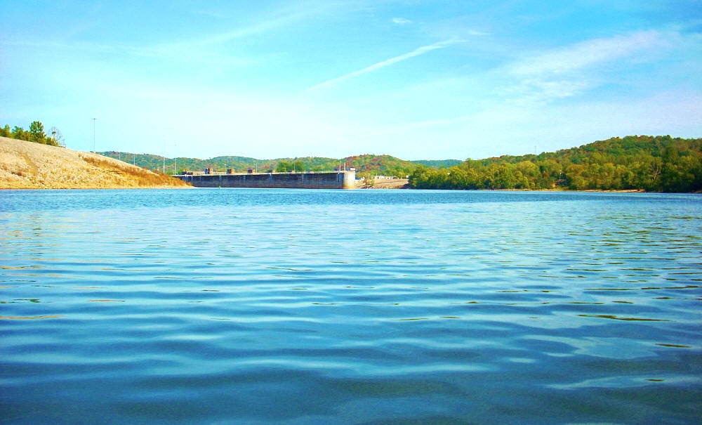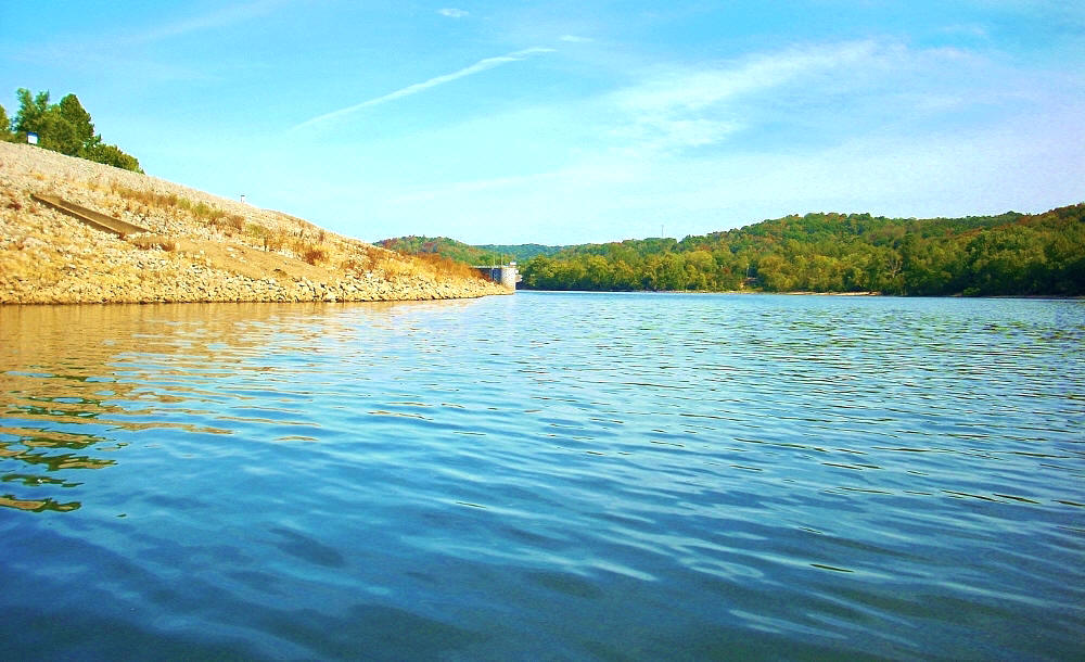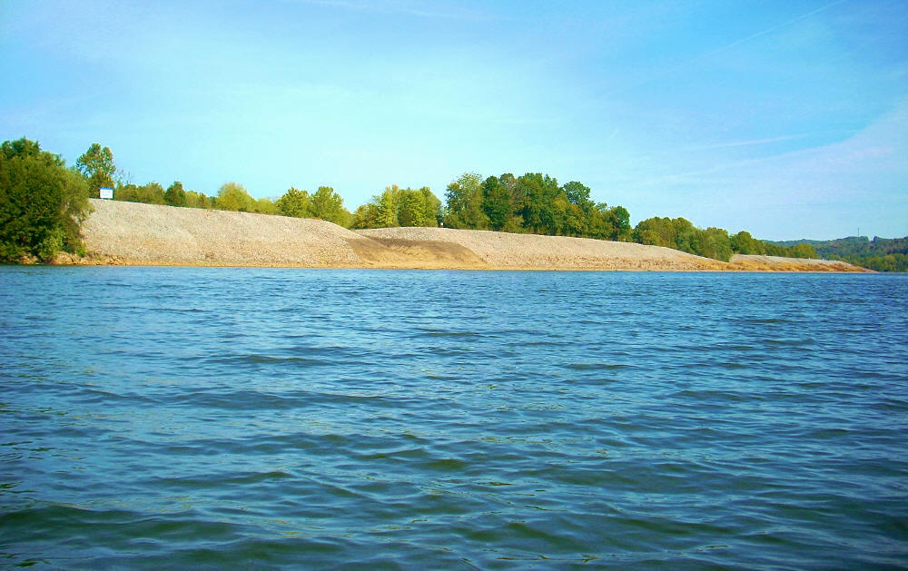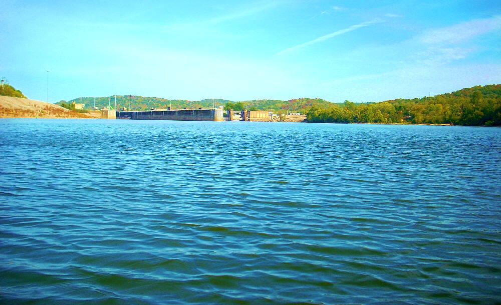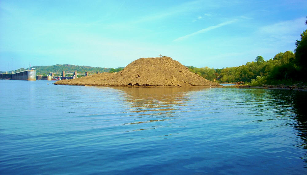 From this point you're looking at another long straight section that extends for about another 2 1/2 miles and down at the end you'll note what looks like a large pile of sand. Well, that pile lies directly across the river from the point at which the lock chamber deposits the boats coming downriver. You can't see the lock wall yet or even the dam itself due to the sharp curve down there.