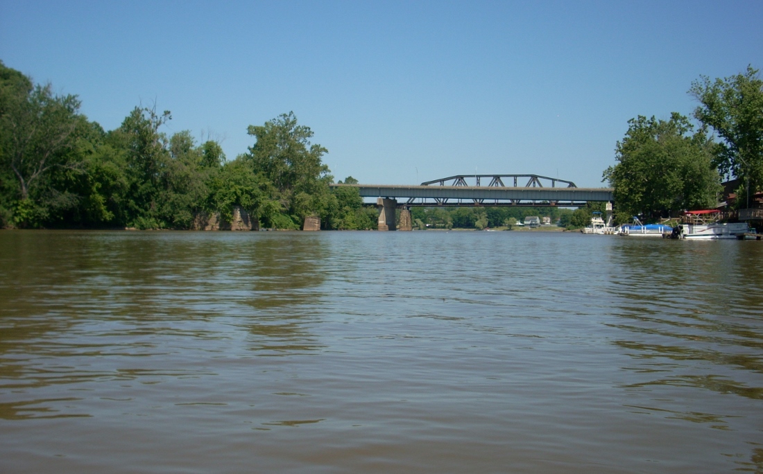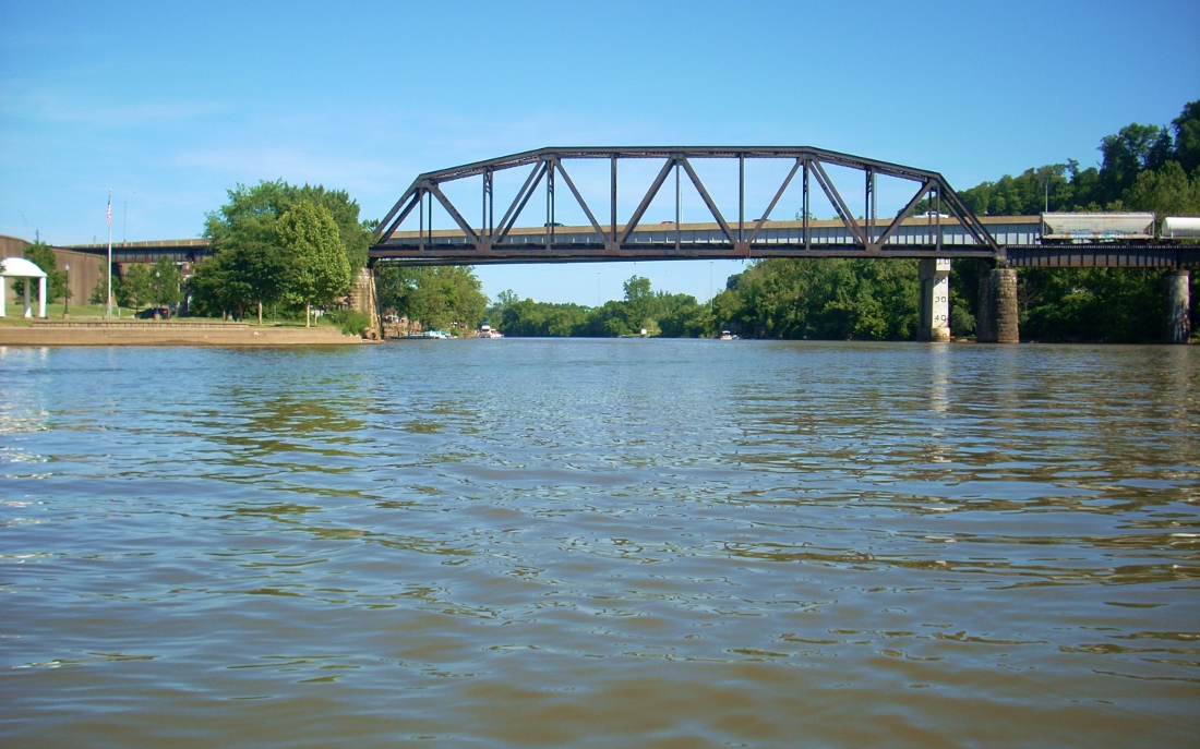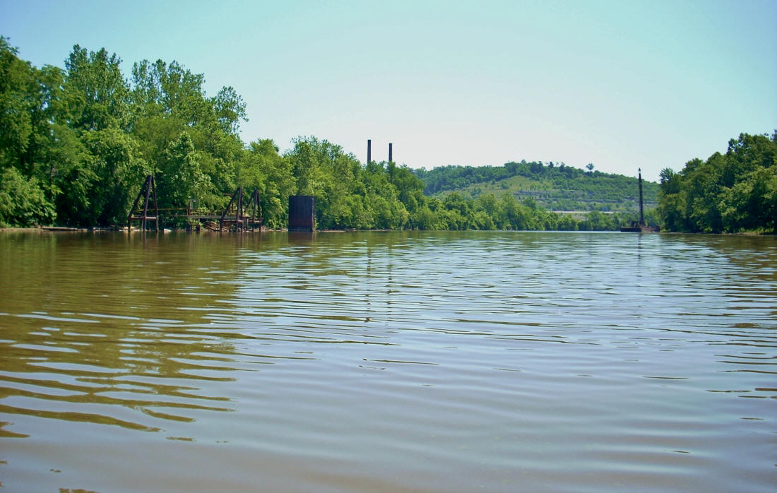 As you might expect being near a large city, there are quite a few things to notice as you enter the Little Kanawha and notable are the 5 bridges within the first two miles. Four of these are for roadways (needless to say, you won't find peace for a little while yet!). There are also remnants of even older spans present and you can see their large concrete supports in the photo below which was taken from this point looking back downriver at the Ohio. A couple private ramps come in on the right side here too across from the marina.