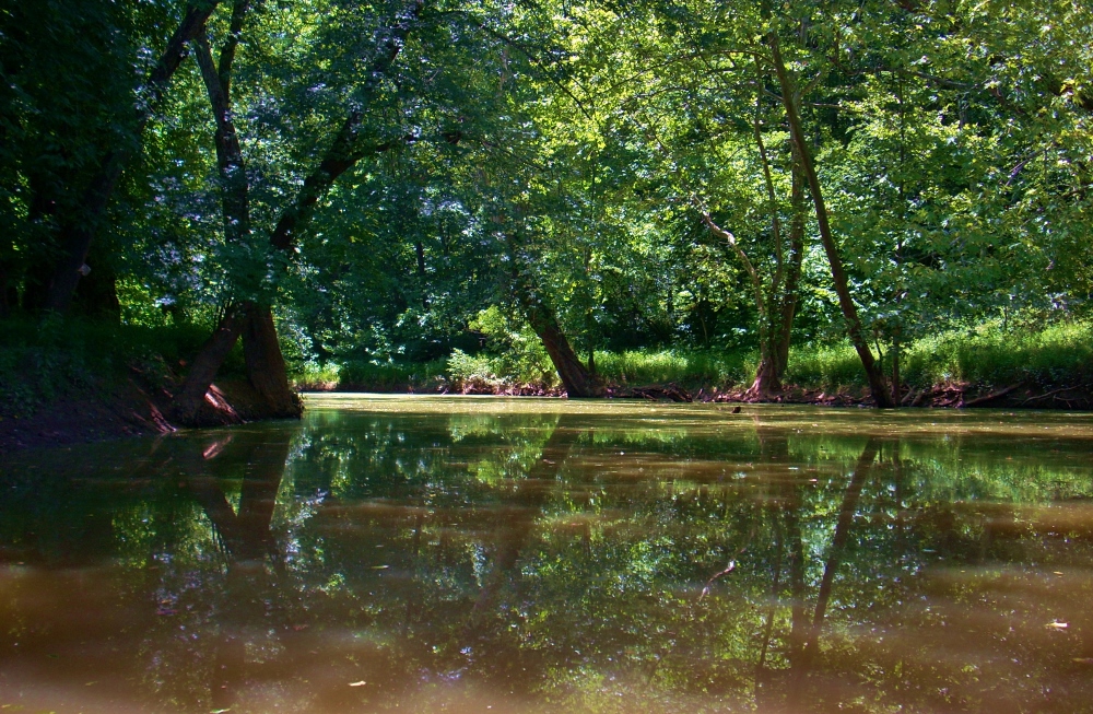 Big Tygart Creek was nice. There's an old iron structure just inside on the right at a point which looks to coincide with a boat house location. I noticed what looked like quite a few paddle racing boats up there but I can't find a name. Anyway, I went about a mile up before I had to turn back due to time constraints. Here's a scene from the creek, which at some points looked like it might have bordered an orchard. All this was a pleasant respite from the sun on this mid 80's summer day!