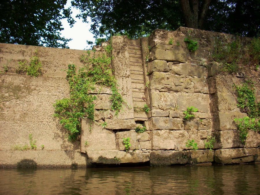 Below are some photos of the area around old lock and dam 2 at mile 15.5. I suppose you could use the ladder in the third photo, but I'm not sure you'd want to. I saw a mighty large spider in residence. Legs and all, it was about the size of a coffee cup lid in terms of circumference! I sure wish they'd clear a little more area for parking up there. If they did this would be a much more viable put in - at least for paddlers. I did see some guys clearing an area as I paddled by, but I'm thinking that they were doing so for the benefit of one of the dwellings. All of this will be on your left side, but on the right you'll see a spot where a railed concrete wall slopes down to the water. It's on the site of a residence now, but was this perhaps a business at one time?