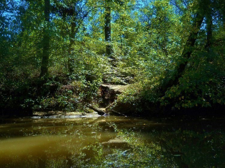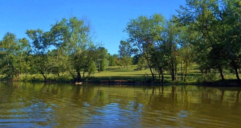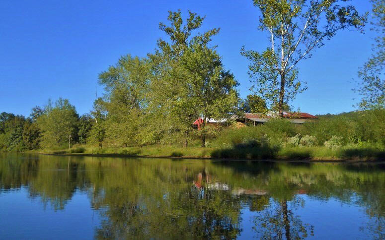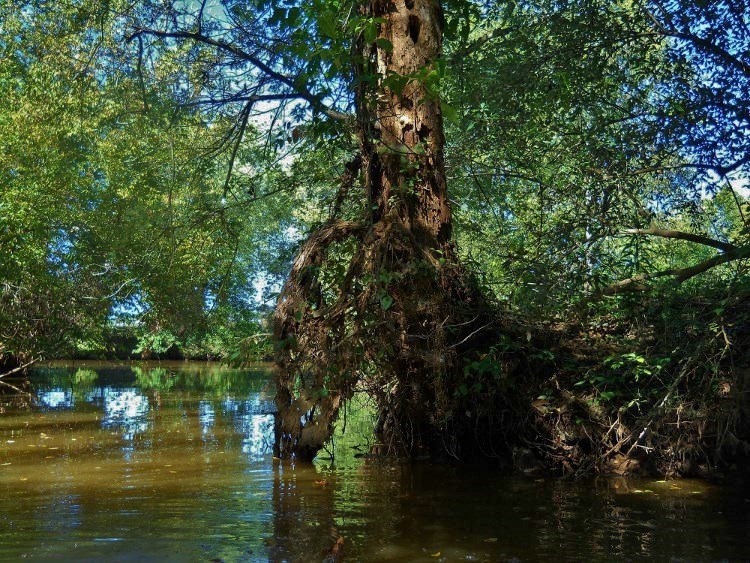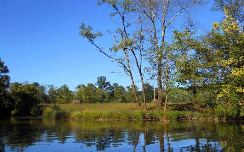 Shortly I saw some wooden bridges up on the right shoreline and I wondered what they were for… I guessed that they could be for a hiking trail or that there might even be a golf course up there. What was it? Turns out, it was the Jackson County Junior Fairgrounds! I can’t find out if the grounds are used for anything but the fair, but I do know that it took me a while to paddle the section of river they occupy. Meanwhile, there are some more amazing scenes in here that you can get partial glimpses of through the trees. There was also an accessible boat ramp here at one time. It's still visible, but the bottom has long ago been covered over with earth.